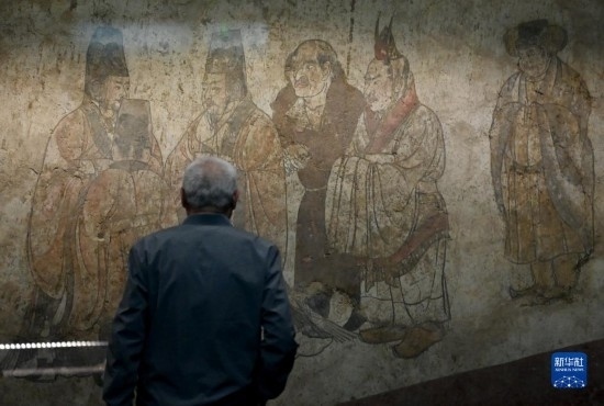 這是在陜西歷史博物館拍攝的唐章懷太子墓《客使圖》(局部)(5月11日攝)?!犊褪箞D》描繪的是唐代外交機(jī)構(gòu)鴻臚寺官員接待外國(guó)使節(jié)的場(chǎng)景。
