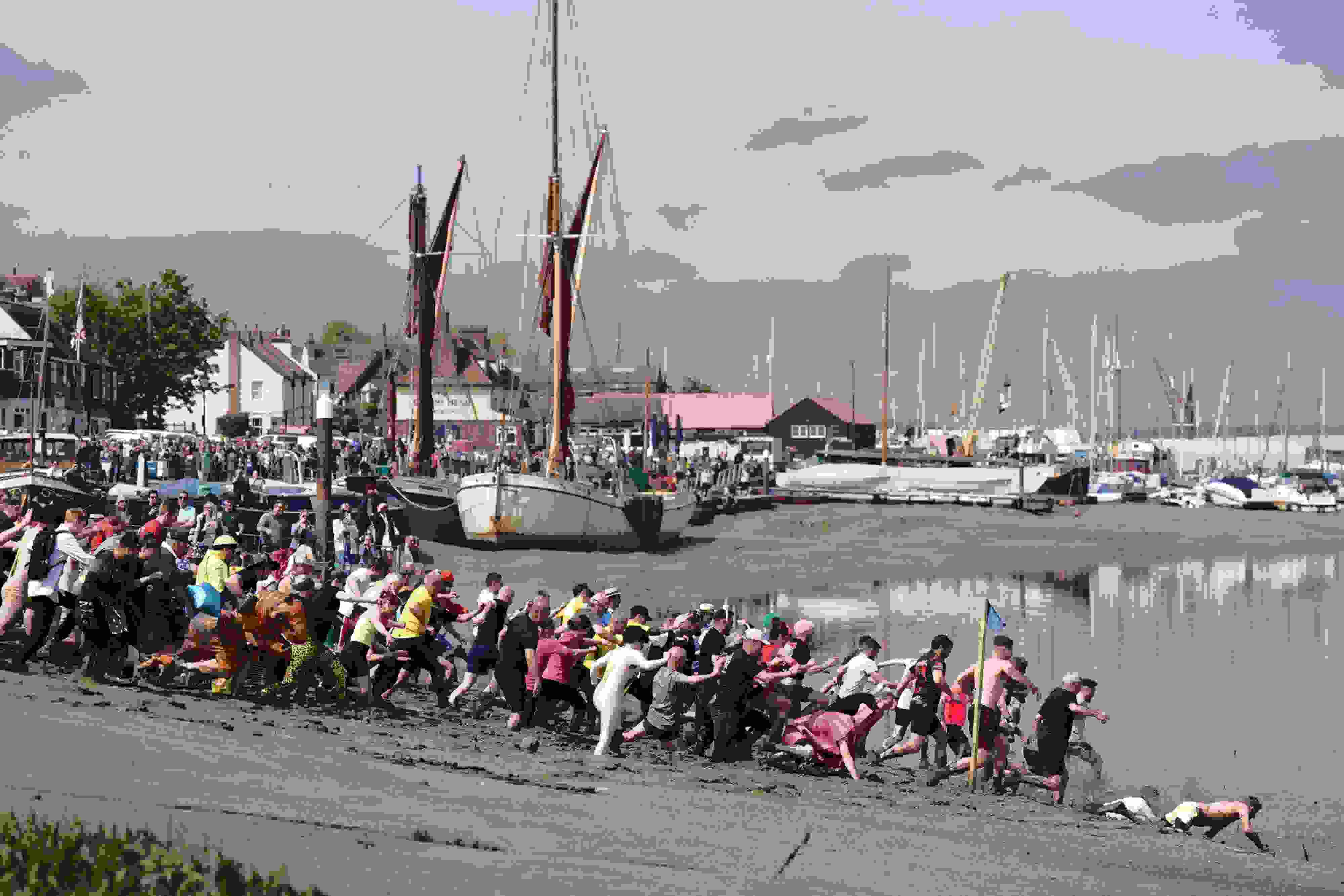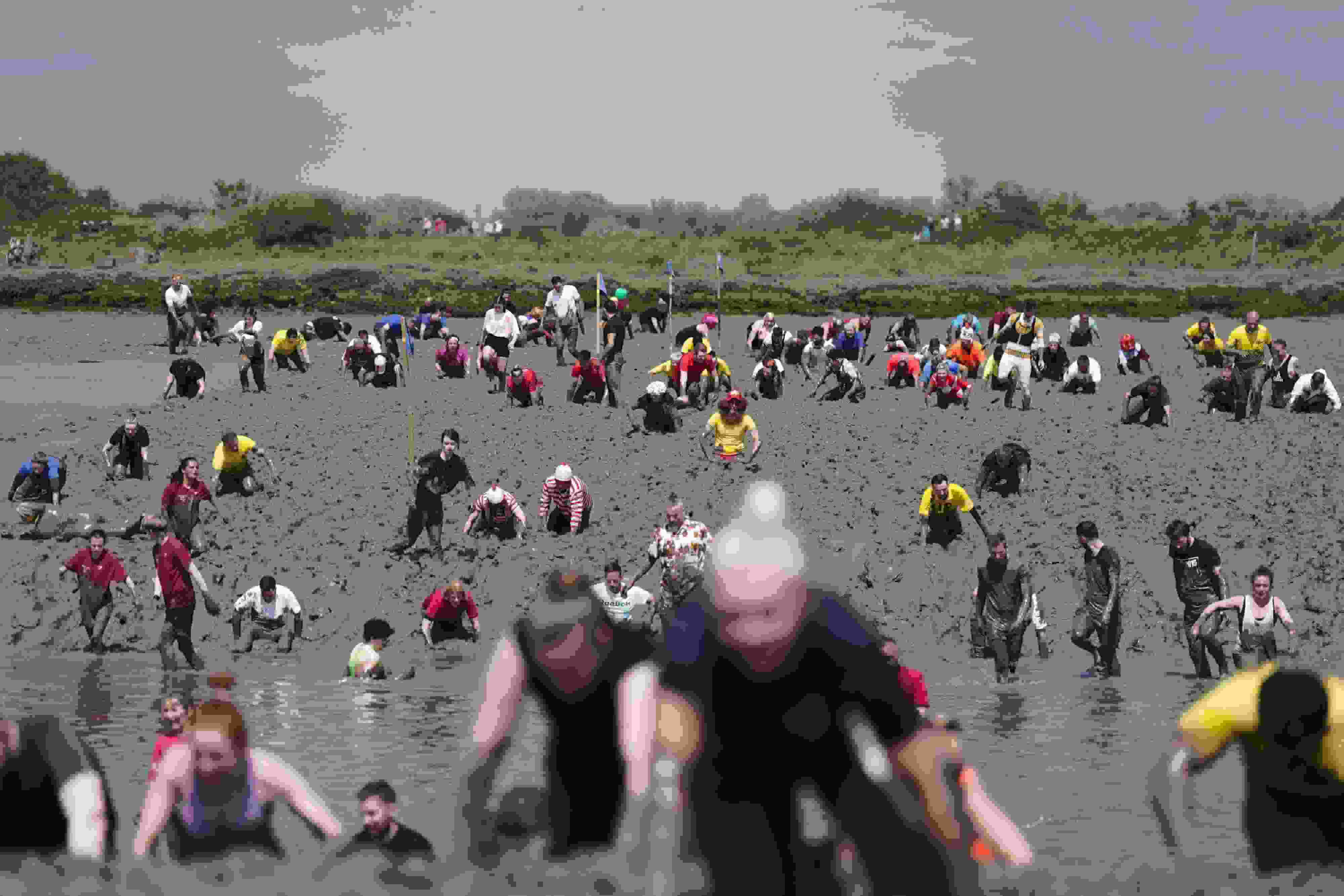 當(dāng)?shù)貢r間2023年5月14日,英國莫爾登,參賽者參加一年一度的滾泥巴大賽。該大賽是一項慈善活動,參賽者要在埃塞克斯郡的黑水河河床上賽跑。 視覺中國
