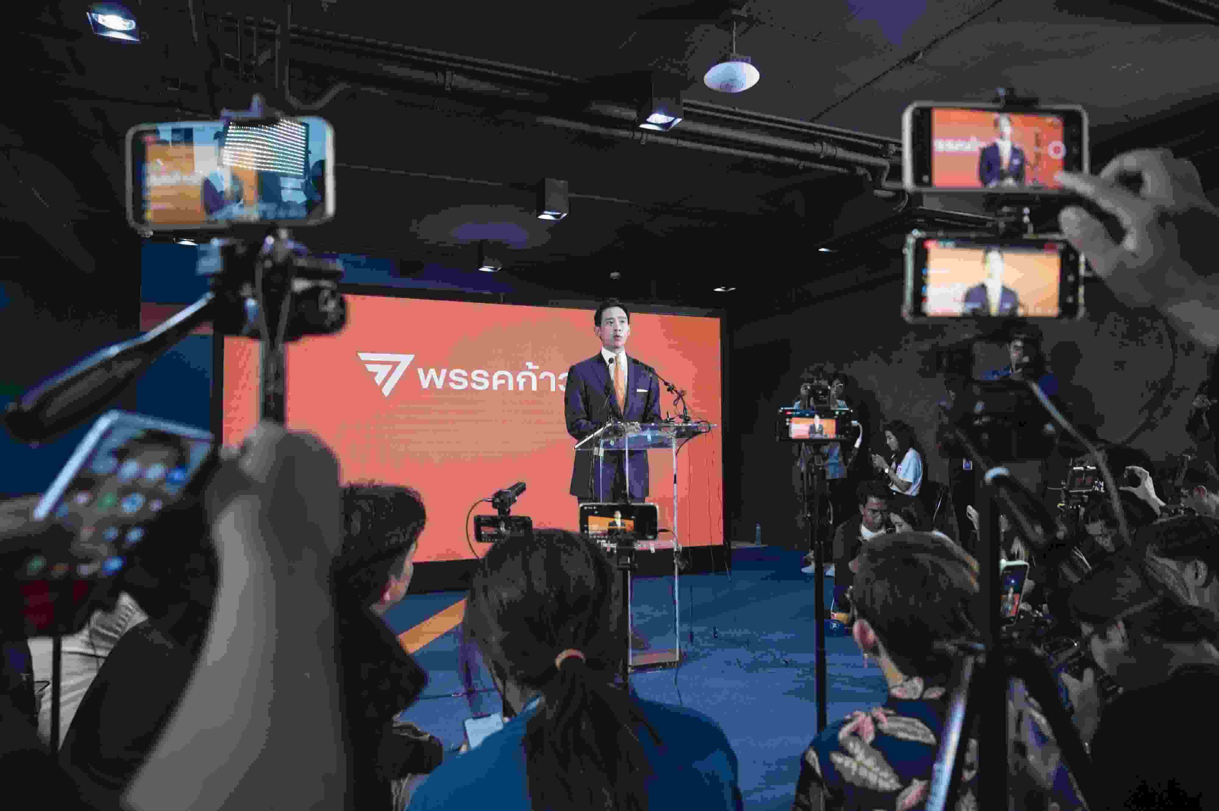 當?shù)貢r間2023年5月15日,泰國曼谷,泰國遠進黨黨魁皮塔在該黨總部舉行記者招待會。當日中午,在泰國國會下議院選舉中獲得選票數(shù)和下議院席位數(shù)暫時領先的遠進黨黨魁皮塔宣布遠進黨在此次選舉中獲勝,已經做好組建新一屆政府的準備,自己也已準備好擔任總理一職。 視覺中國
