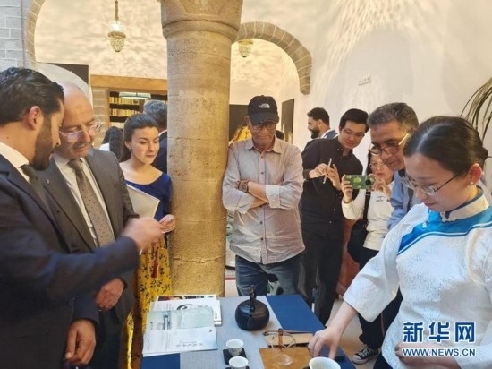 5月22日,在摩洛哥索維拉的“茶和天下·雅集”活動暨中摩茶文化展上,嘉賓欣賞中國茶禮表演。(中國文化中心供圖)