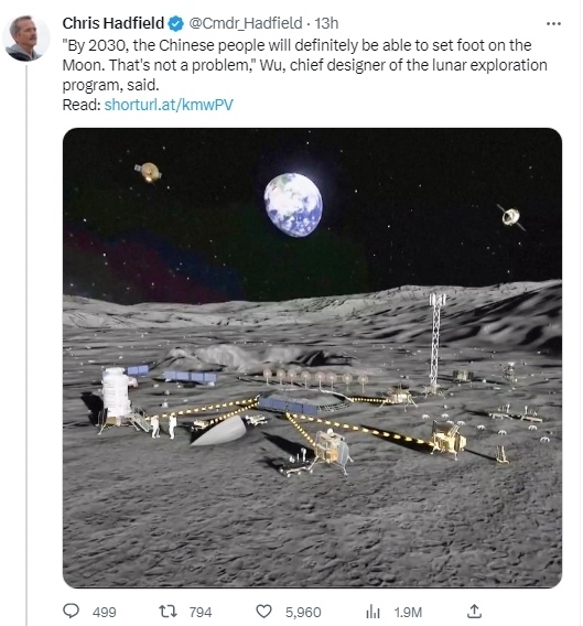 據(jù)報(bào)道,加拿大航天局前宇航員克里斯·哈德菲爾德在社交媒體推特上轉(zhuǎn)發(fā)了CGTN的一篇報(bào)道,他同時(shí)寫道,“中國探月工程總設(shè)計(jì)師吳偉仁說,‘到2030年,中國人的足跡一定能夠踏上月球。這不是個(gè)問題?!?/p>