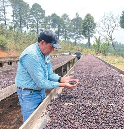 魯本·里維拉向記者展示晾曬中的咖啡豆。本報記者 彭 敏攝