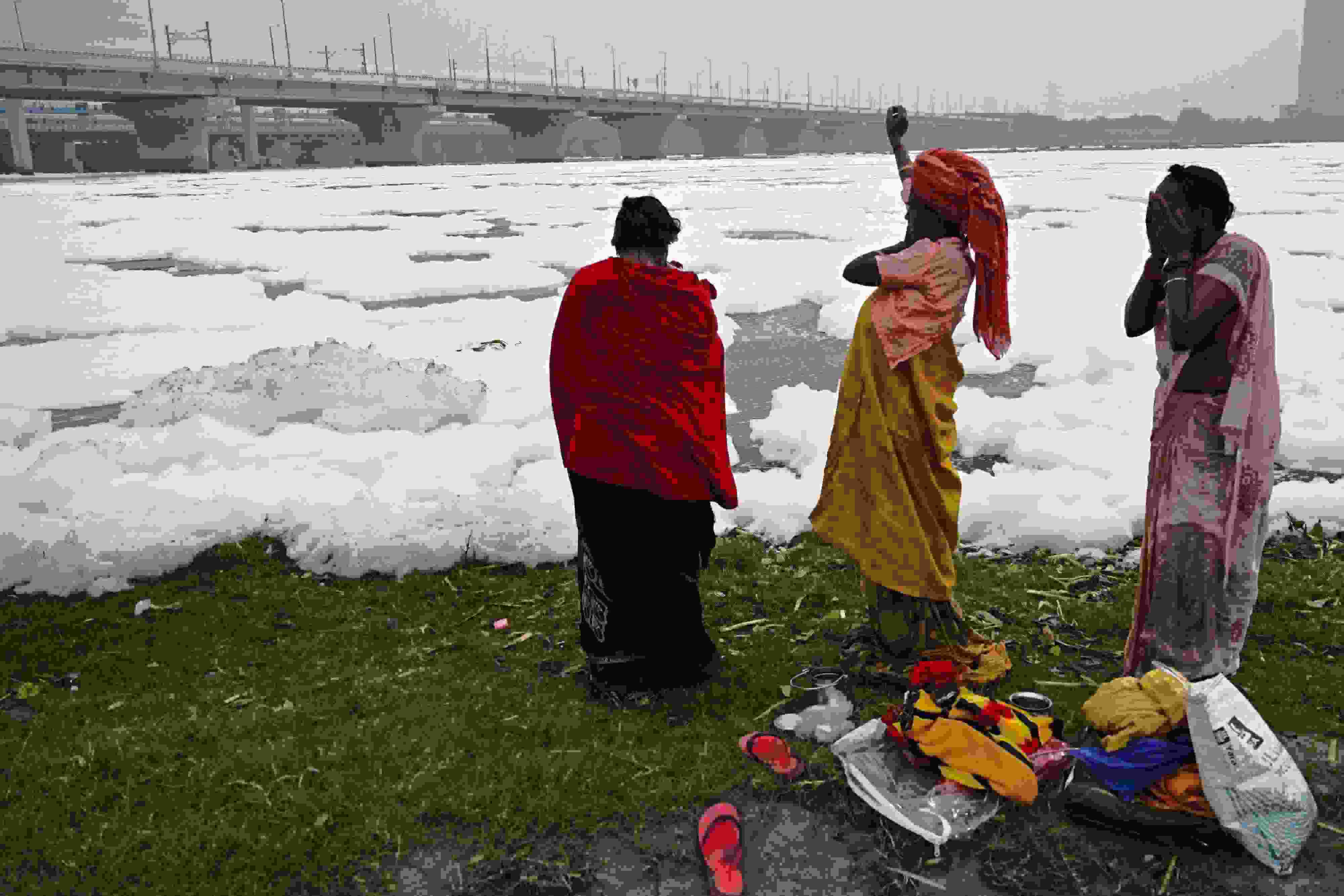 當(dāng)?shù)貢r(shí)間2023年6月4日,印度新德里,世界環(huán)境日前夕,人們?cè)诔錆M(mǎn)有毒泡沫的亞穆納河中沐浴。 視覺(jué)中國(guó)