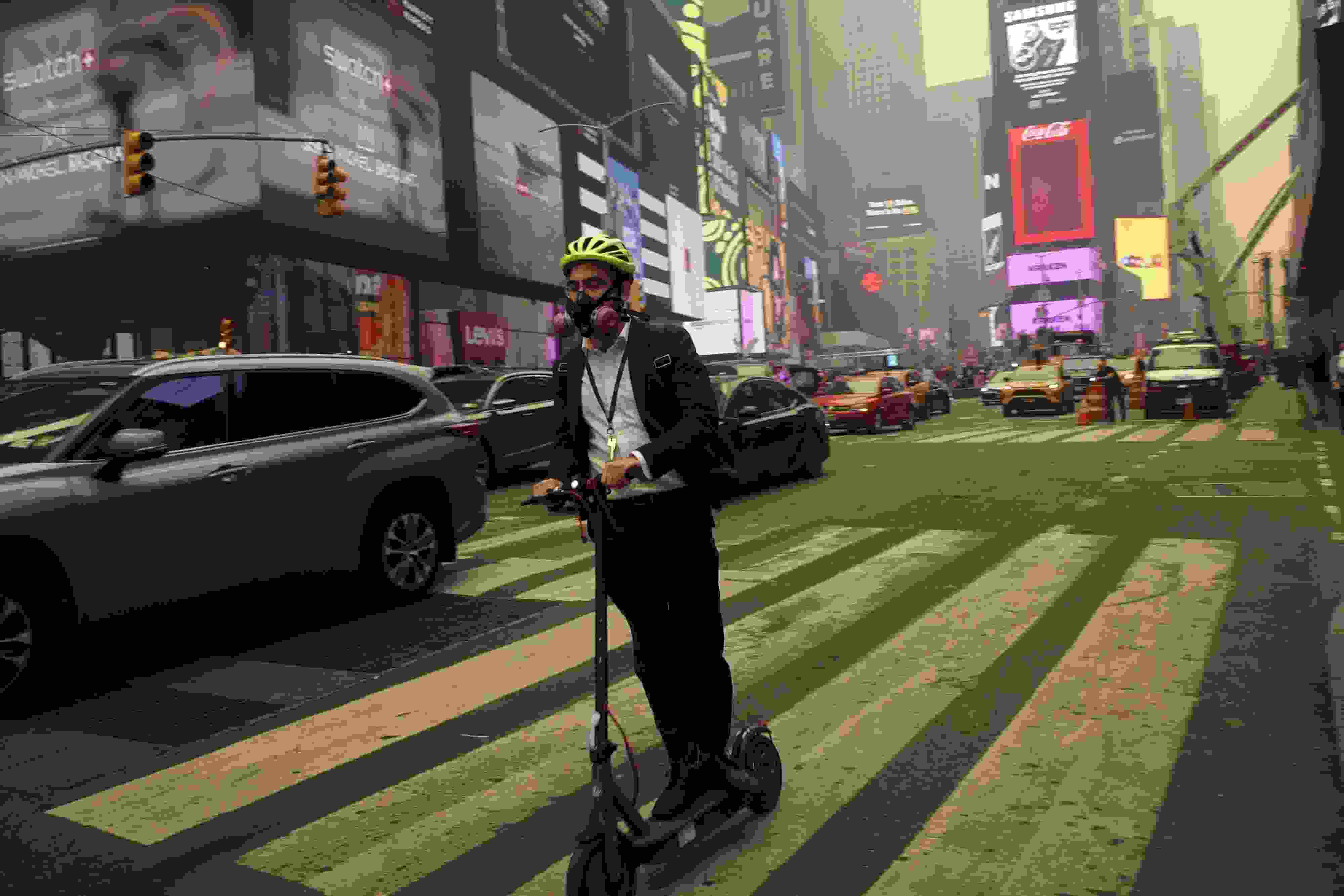 當(dāng)?shù)貢r(shí)間6月7日,美國紐約時(shí)報(bào)廣場的一位騎行者佩戴著呼吸過濾器。近日,加拿大野火產(chǎn)生的煙霧蔓延至美國,紐約市出現(xiàn)霧霾,戶外民眾嚴(yán)密防護(hù)。 視覺中國