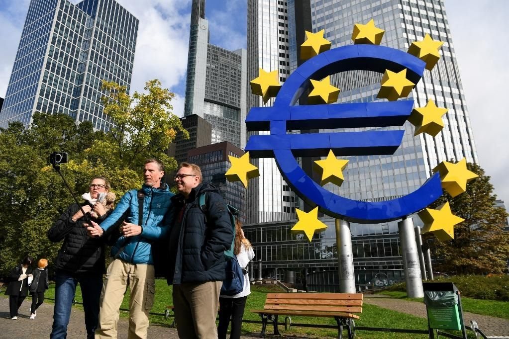 2021年10月13日,人們在德國法蘭克福歐元雕塑前自拍留影。新華社記者 逯陽 攝