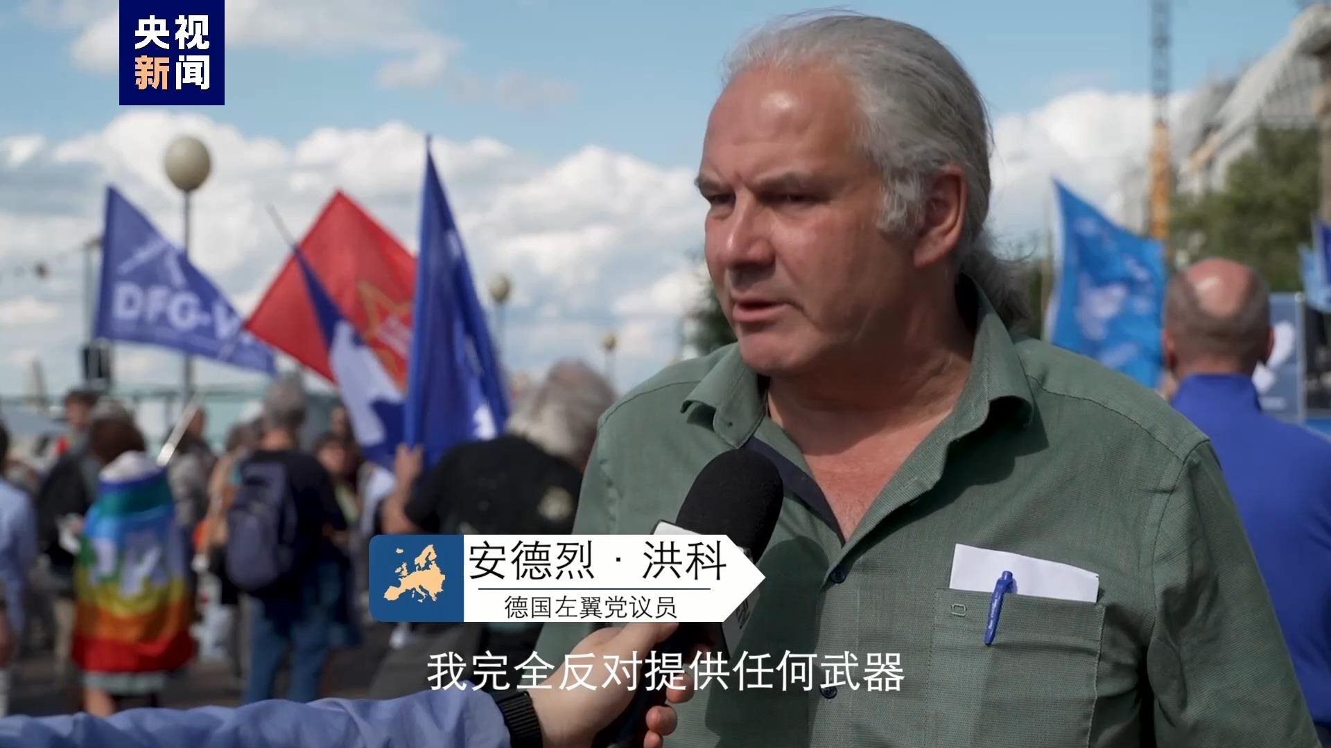 德國民眾 沃爾夫?qū)?/strong>:我們?cè)谶@里(柏林)要求立即實(shí)現(xiàn)?;?。作為和平主義者我們反對(duì)北約,反對(duì)軍事手段。軍事手段不是俄烏沖突的解決方案。俄烏沖突只能通過外交手段解決。