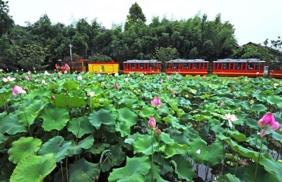 2019年7月21日,游客在浙江省安吉縣魯家村乘坐小火車游覽。新華社記者譚進(jìn)攝