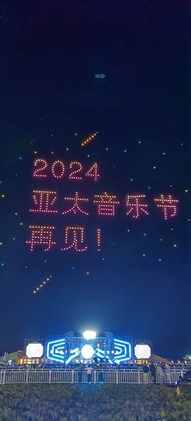 在氣氛最熱烈的時候,500架無人機(jī)緩緩升空,列隊表演,不斷變換陣型,時而在空中呈現(xiàn)出“亞太音樂節(jié)”、“中國外文局亞太傳播中心”、“太仆寺旗歡迎您”等巨幅字幕,時而呈現(xiàn)吉他、音符、蒙古包等色彩繽紛的圖案。