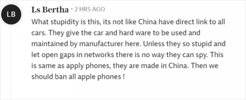 “這是多么愚蠢啊,中國又不是和所有汽車都有直接聯(lián)系。他們把汽車和硬件交給這里的制造商使用和維護(hù)。除非他們蠢到讓網(wǎng)絡(luò)出現(xiàn)漏洞,否則他們不可能進(jìn)行間諜活動。這和蘋果手機(jī)一樣,都是中國制造的。那么我們應(yīng)該禁止所有蘋果手機(jī)!”