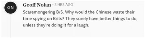 “危言聳聽。中國人為什么要浪費(fèi)時間監(jiān)視英國人?他們肯定有更好的事情要做,除非他們這么做是為了搞笑?!?/p>