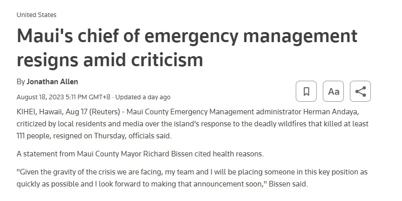 路透社8月18日報道,毛伊縣緊急事務(wù)管理機構(gòu)負責(zé)人赫爾曼·安達亞在當(dāng)?shù)鼐用窈兔襟w的一片“救災(zāi)不利”的譴責(zé)聲中辭職。截至17日,致命山火已經(jīng)造成至少111人死亡。一些毛伊島居民認為,如果能更早拉響警報,會挽救更多生命。