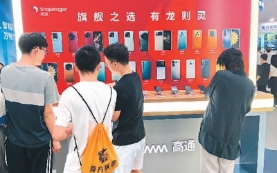 觀眾在高通展區(qū)體驗(yàn)搭載驍龍移動平臺的智能手機(jī)。