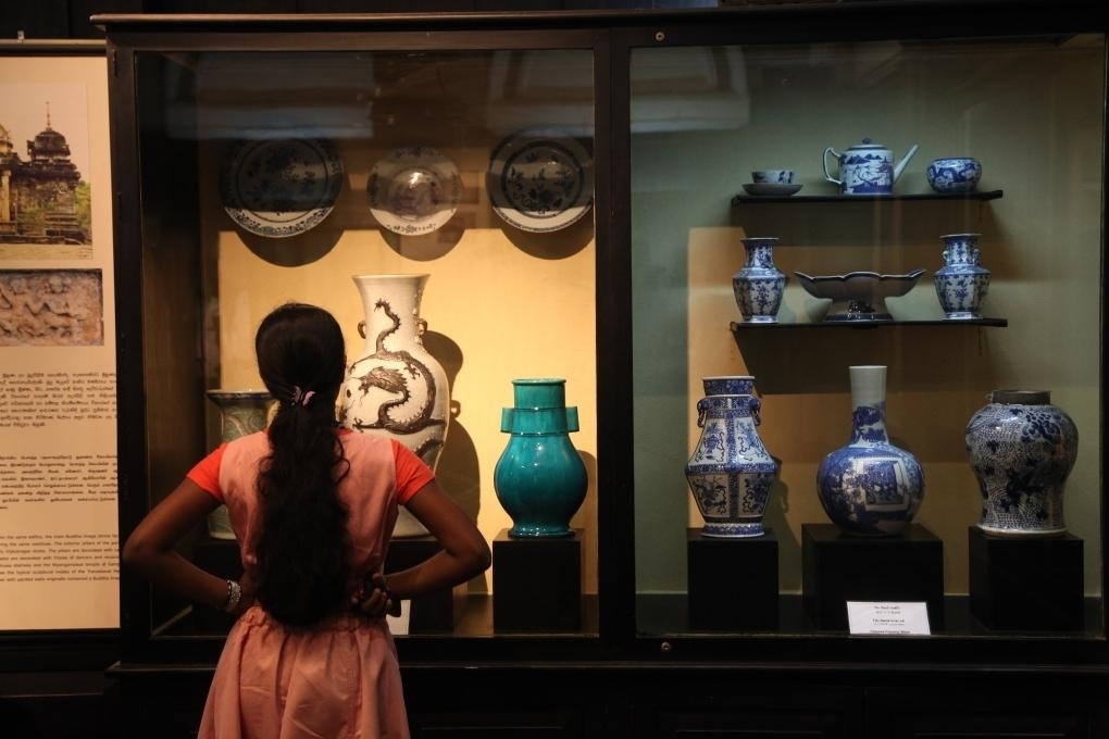 2014年9月15日,在斯里蘭卡首都科倫坡,游客參觀斯里蘭卡國家博物館展出的當?shù)爻鐾恋闹袊糯善?,一些中國外銷瓷器上還繪有南亞、伊斯蘭風情,與鄭和碑共同見證著古代海上絲綢之路和中斯友好交往的源遠流長。 新華社記者馮武勇攝