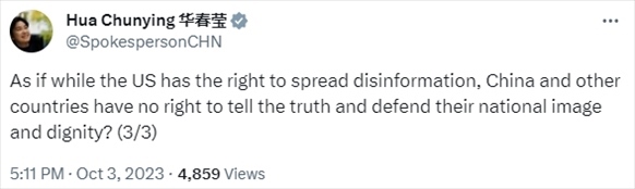 “仿佛美國(guó)有權(quán)利散布虛假信息,而中國(guó)等國(guó)家卻無權(quán)說實(shí)話、維護(hù)國(guó)家形象和尊嚴(yán)?”