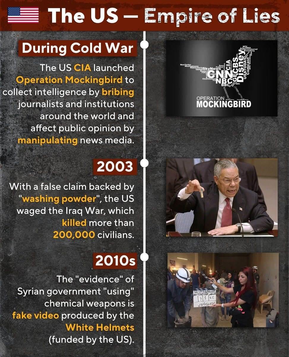 早在冷戰(zhàn)期間,美國(guó)中央情報(bào)局發(fā)起了“知更鳥計(jì)劃”,通過賄賂世界各地的記者和機(jī)構(gòu)來收集情報(bào),并通過操縱新聞媒體來影響公眾輿論。新世紀(jì)借“洗衣粉”“白頭盔”,美國(guó)對(duì)伊拉克、敘利亞悍然發(fā)動(dòng)侵略戰(zhàn)爭(zhēng),造成數(shù)十萬平民死亡。