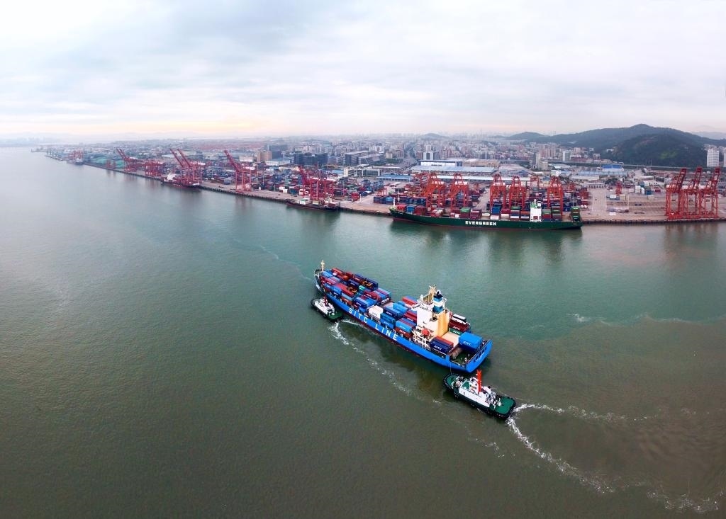 在福建自貿區(qū)廈門片區(qū)東渡港區(qū),一艘貨輪向碼頭靠攏(2017年8月26日無人機照片)。(新華社記者姜克紅攝)