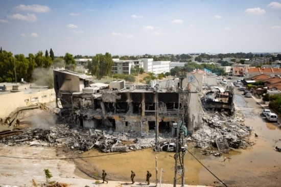 10月8日,在以色列南部城市斯代羅特,以軍將哈馬斯武裝人員曾躲藏的警察局辦公樓拆除。新華社/基尼圖片社