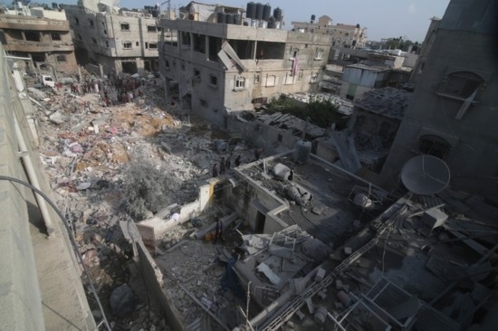 10月8日,在加沙城,巴勒斯坦人查看以色列空襲后的建筑廢墟。新華社發(fā)(里澤克·阿卜杜勒賈瓦德攝)