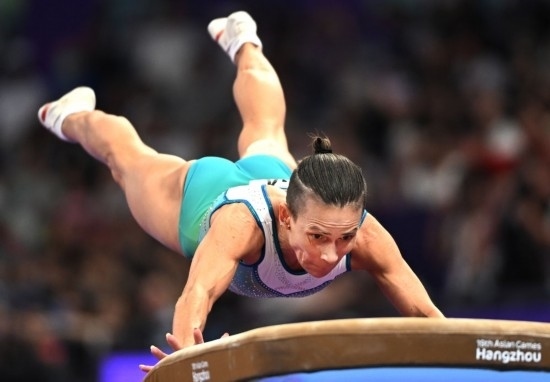 9月28日,烏茲別克斯坦選手奧克薩娜·丘索維金娜在杭州亞運(yùn)會(huì)競技體操項(xiàng)目女子跳馬決賽中,最終她獲得第四名。新華社記者 程敏 攝