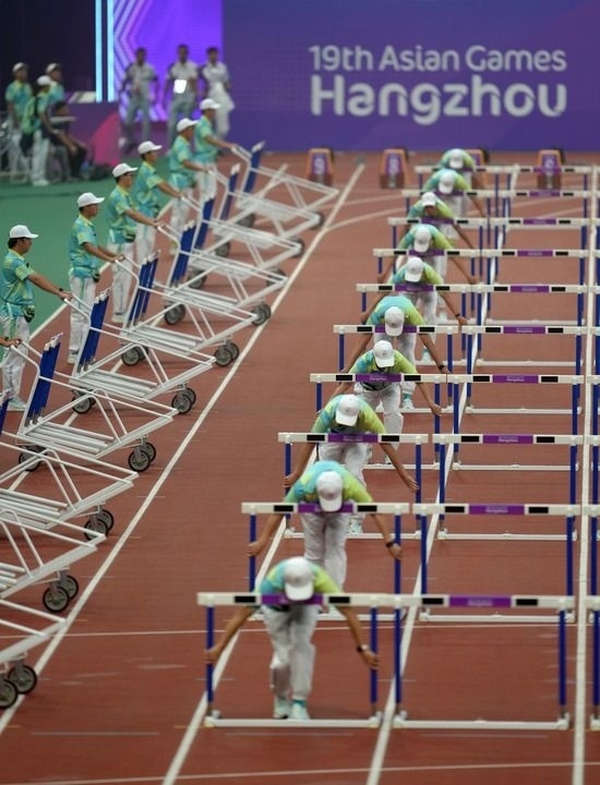 9月30日,杭州亞運(yùn)會(huì)志愿者在田徑項(xiàng)目女子七項(xiàng)全能100米欄比賽前進(jìn)行場地準(zhǔn)備工作。新華社記者 江文耀 攝