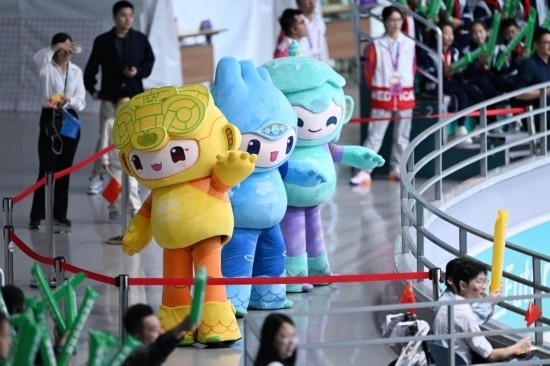 10月7日,杭州亞運(yùn)會(huì)吉祥物在女子花樣輪滑單人滑比賽前的暖場活動(dòng)中。新華社記者 陳曄華 攝