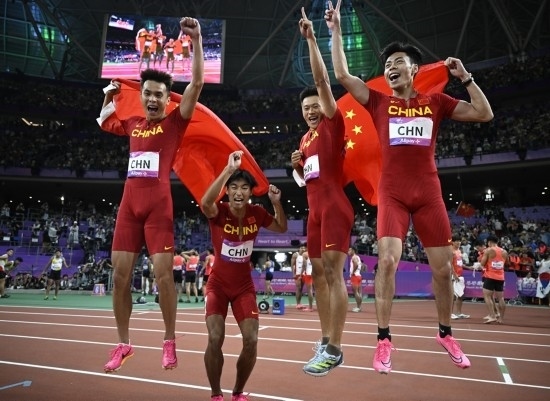 10月3日,中國選手陳冠鋒、謝震業(yè)、陳佳鵬、嚴(yán)海濱(從右至左)慶祝奪得杭州亞運(yùn)會(huì)田徑項(xiàng)目男子4x100米接力冠軍。新華社記者 宋彥樺 攝