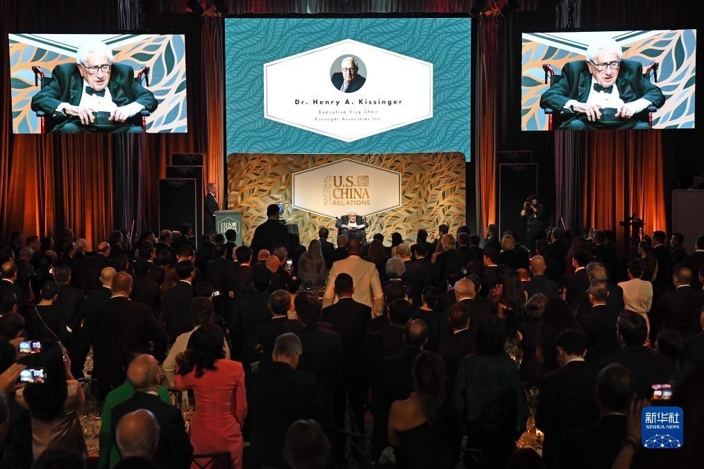 10月24日,美國前國務(wù)卿基辛格(中)出席在紐約舉行的美中關(guān)系全國委員會年度頒獎晚宴。新華社記者 李睿 攝