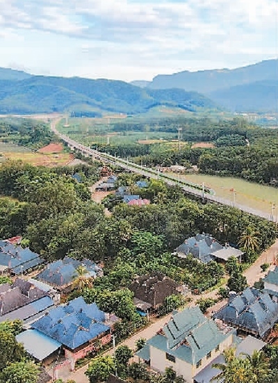 云南省景洪市勐罕鎮(zhèn),中老鐵路上的動(dòng)車從傣族村寨旁駛過(guò)。新華社發(fā)