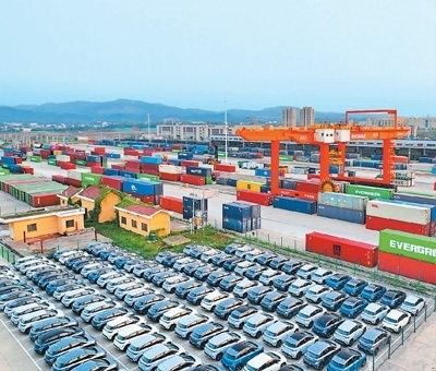 11月28日,在位于江西省贛州市南康區(qū)的贛州國際陸港,比亞迪新能源汽車將通過鐵路運送至深圳鹽田港出口國外。