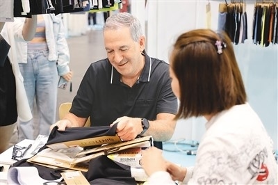 7月19日,在美國紐約舉辦的第24屆中國紡織品服裝貿(mào)易展覽會上,客商(左)在一家中國上海的企業(yè)展位選看面料。