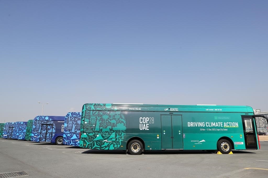 2023年12月3日,中國蘇州金龍公司的海格電動巴士(前)??吭诼?lián)合國氣候變化迪拜大會的擺渡車停車場。新華社記者 王東震 攝