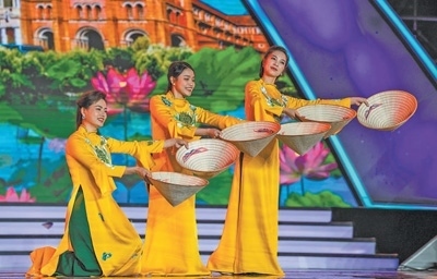 11月30日,2023年瀾滄江·湄公河流域國家文化藝術(shù)節(jié)開幕式暨文藝晚會(huì)在云南景洪市舉行。圖為來自越南的藝術(shù)工作者在表演舞蹈《斗笠舞》。新華社記者 胡 超攝