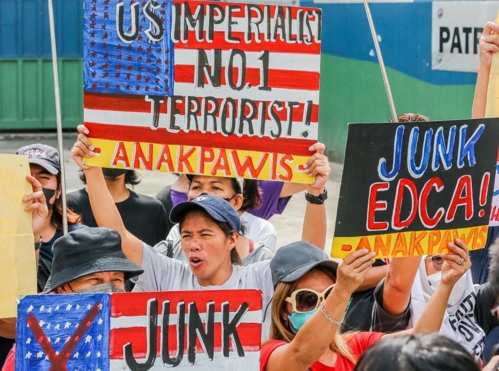 2023年4月11日,在菲律賓首都大馬尼拉地區(qū)奎松城,民眾參加集會活動,抗議菲律賓和美國軍方舉行聯合軍事演習。菲律賓和美國軍方當天在菲首都馬尼拉啟動為期18天的2023年度“肩并肩”聯合軍事演習。新華社發(fā)(烏馬利攝)
