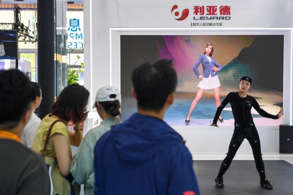 9月5日,在服貿(mào)會首鋼園區(qū)的電信、計算機(jī)和信息服務(wù)專題展內(nèi),參觀者觀看一家企業(yè)的數(shù)字人驅(qū)動解決方案演示。新華社記者 鞠煥宗 攝