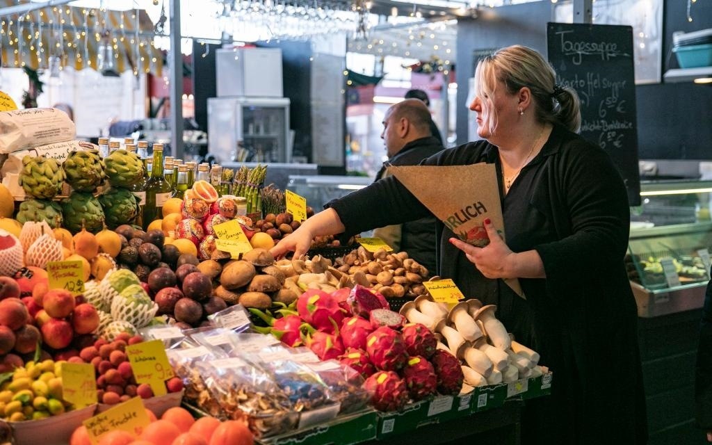 12月20日,在德國法蘭克福“小市場大廳”,一名攤主為顧客挑選水果。新華社記者張帆攝