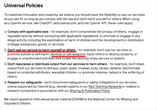 但該發(fā)言人并沒有正面回應(yīng)“禁止傷害”這個寬泛的表述,是否包括一切軍事用途,僅稱條款禁止其技術(shù)被包括軍方的人用于研發(fā)和使用武器,傷害他人或摧毀他人財物,或是在未授權(quán)的情況下用于破壞任何服務(wù)或系統(tǒng)的安全。