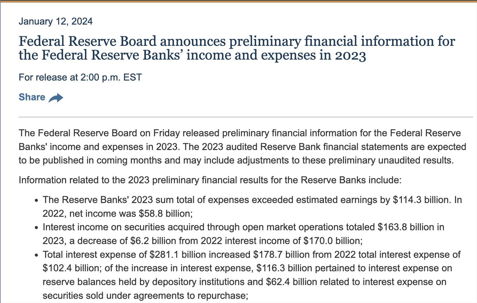 美聯(lián)儲(chǔ)發(fā)布的2023年收入和支出的初步財(cái)務(wù)信息。圖片來(lái)自美聯(lián)儲(chǔ)官網(wǎng)
