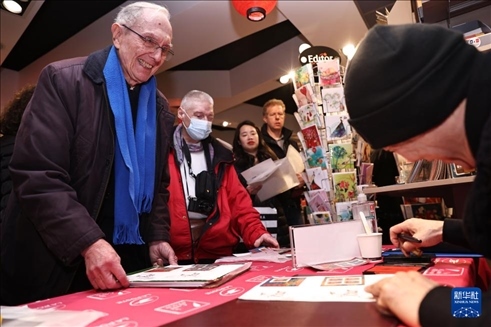 1月26日,在法國巴黎舉行的發(fā)行儀式上,郵票設計者陳江洪為當地集郵愛好者簽字留念。新華社記者 高靜 攝