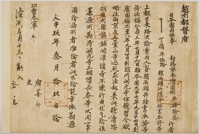 圓珍返回日本后,始終保持著與唐朝高僧、學(xué)者的交流。他在年近古稀時(shí)仍一心鉆研佛法,并修書向大唐僧人尋求關(guān)于佛法的權(quán)威解釋。在被稱為《圓珍疑問》的書信中,他摘引多部佛法經(jīng)典并列舉疑問,文中出現(xiàn)“乞垂委示”“其義如何”“唐言如何”等請(qǐng)求回答的表述。書信于882年寄往長安友人處,現(xiàn)存版本是圓珍抄錄的副本。