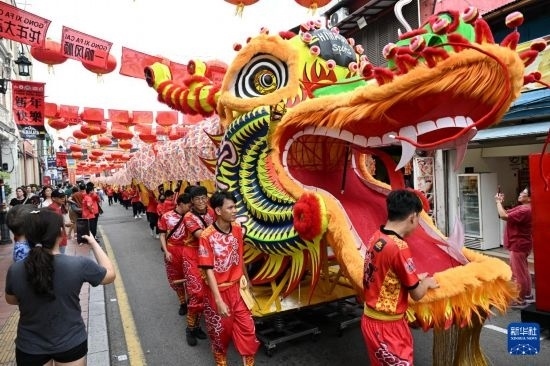 臨近春節(jié),馬來西亞馬六甲市雞場街上大紅燈籠高懸,一派喜慶景象。2月1日,由馬來西亞和中國的100多名青少年組成的舞龍隊,共舞一條近200米的“長龍”在街道上穿行而過,蔚為壯觀,引人注目。