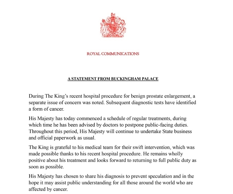 當(dāng)?shù)貢r間2月5日,白金漢宮發(fā)布消息稱,英國國王查爾斯三世在醫(yī)院的診斷檢查中被確診患有癌癥。
