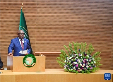 2月17日,在埃塞俄比亞首都亞的斯亞貝巴,非盟委員會主席法基在開幕式上發(fā)言。新華社發(fā)(邁克爾·特韋爾德攝)