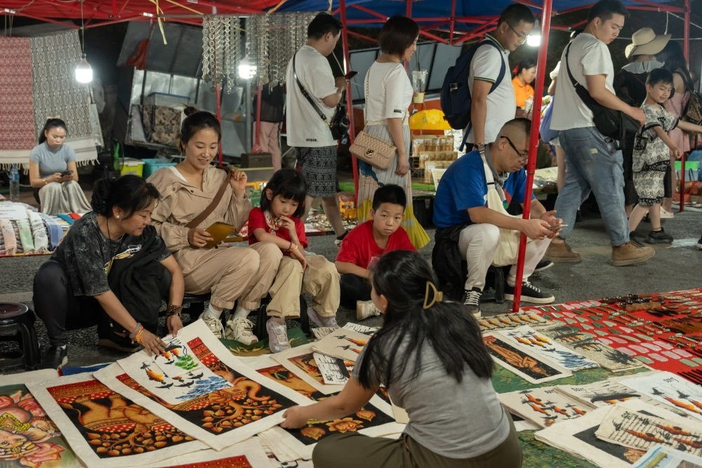 2月16日,游客在老撾瑯勃拉邦夜市上購(gòu)買當(dāng)?shù)貍鹘y(tǒng)手工藝品。