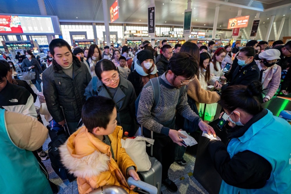 2月14日,乘坐中老鐵路國(guó)際旅客列車前往老撾的游客在昆明南站檢票進(jìn)站。