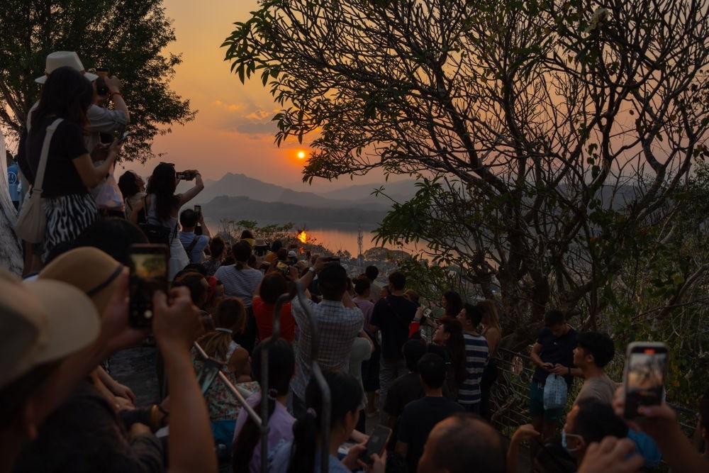 2月16日,在老撾瑯勃拉邦普西山山頂,游客在觀賞落日景觀。湄公河畔、老撾北部群山環(huán)繞的瑯勃拉邦在14到16世紀(jì)間曾是老撾歷史上第一個(gè)統(tǒng)一的多民族國(guó)家瀾滄王國(guó)的首都?,槻罟懦?995年被聯(lián)合國(guó)教科文組織列入世界文化遺產(chǎn),如今已經(jīng)成為老撾歷史與文化的象征。