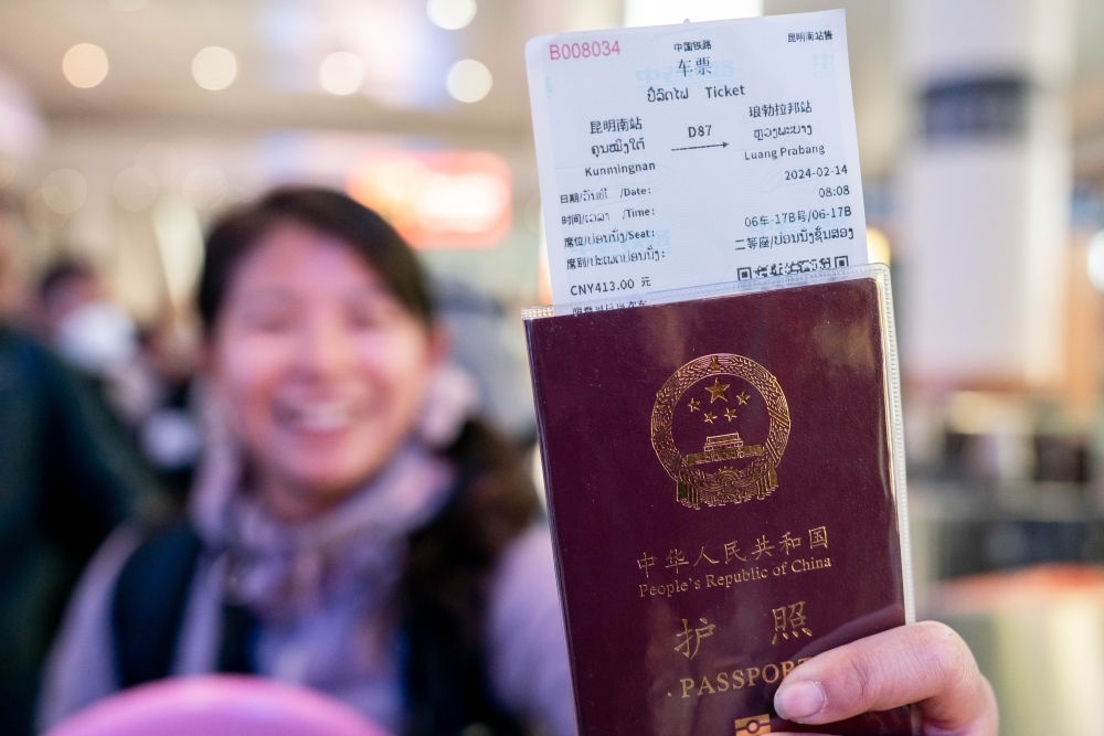 2月14日,乘坐中老鐵路國(guó)際旅客列車前往老撾的游客展示購(gòu)買到的車票。