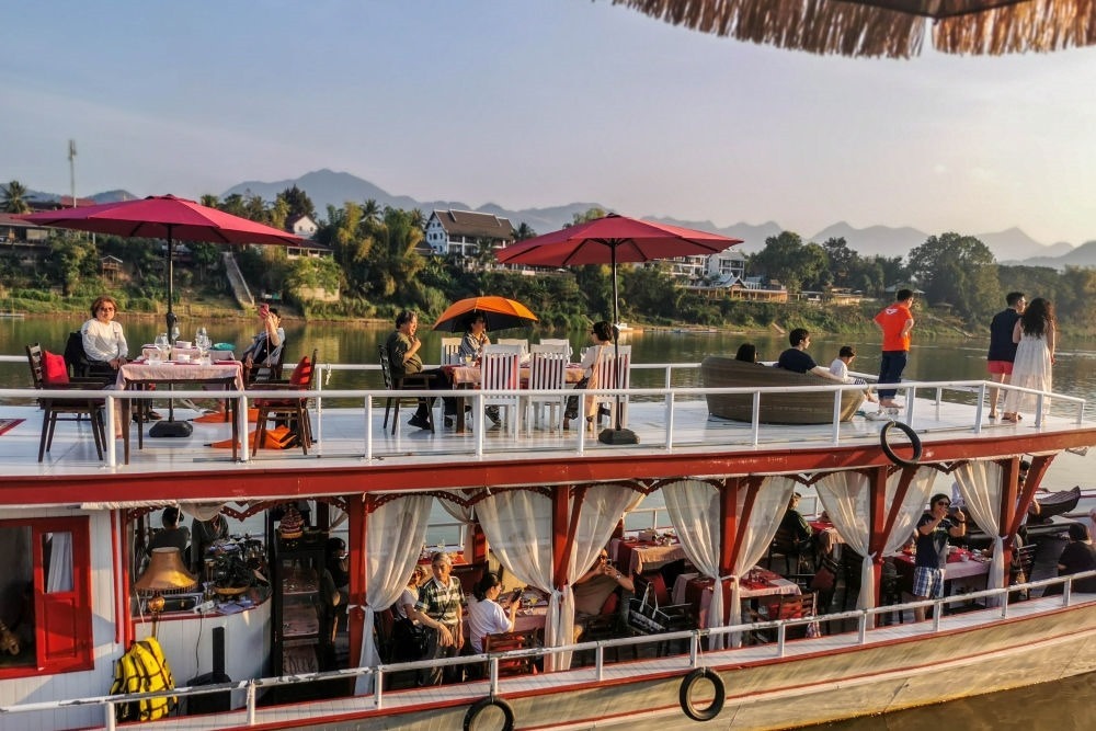 2月12日,中國(guó)游客在老撾瑯勃拉邦乘船游覽湄公河。