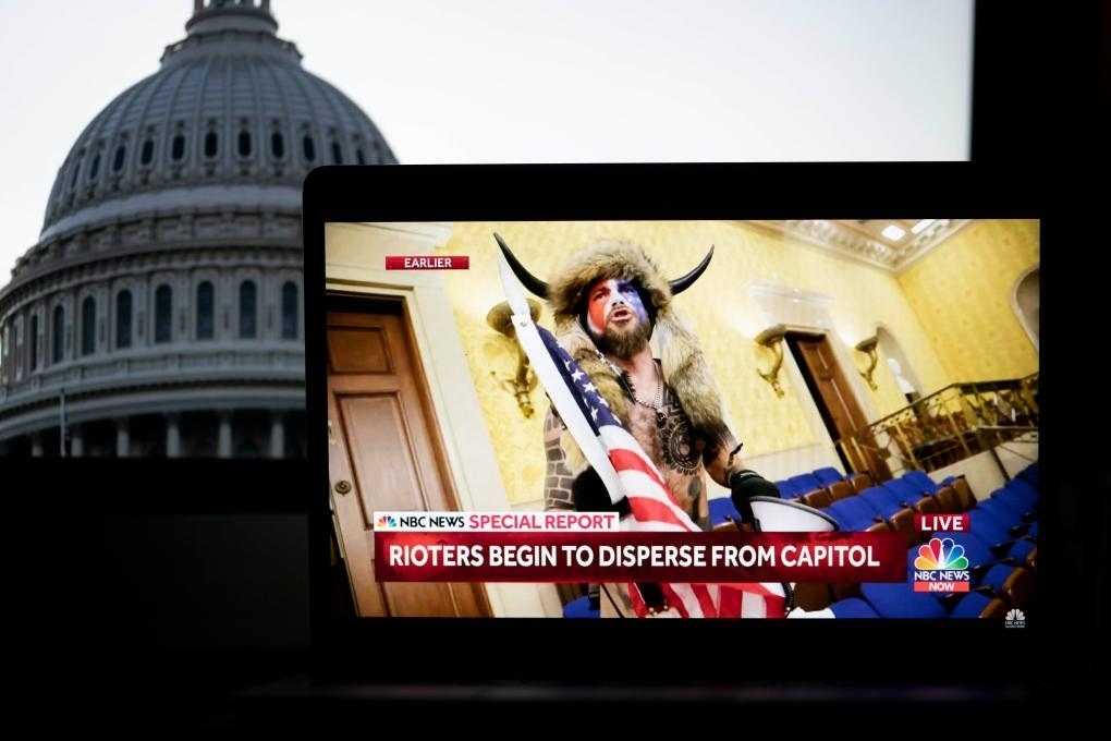 2021年1月6日拍攝的電視畫(huà)面顯示,一名抗議者闖入位于美國(guó)華盛頓的國(guó)會(huì)大廈。新華社記者劉杰攝