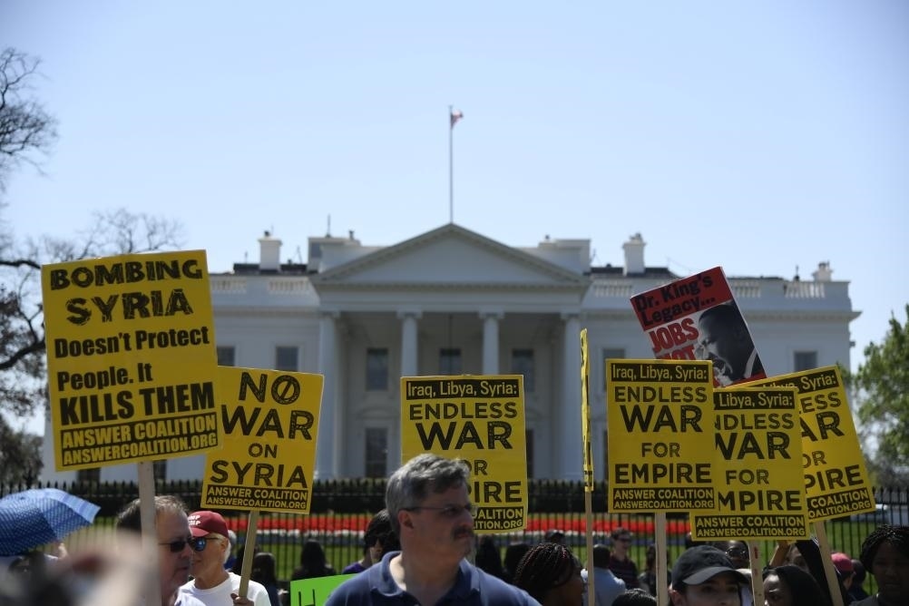 2018年4月14日,在美國(guó)華盛頓白宮北側(cè),人們手持標(biāo)語(yǔ)抗議對(duì)敘利亞進(jìn)行軍事打擊。新華社記者楊承霖?cái)z