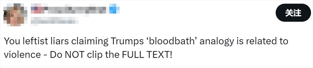另一方面,一些特朗普的支持者則抨擊民主黨人斷章取義。有人說(shuō):“你們這些左翼(民主黨)聲稱特朗普的‘屠殺’與暴力有關(guān)——?jiǎng)e斷章取義!”